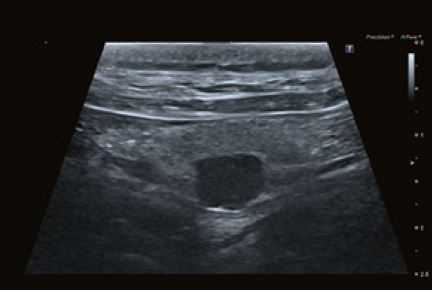 Собака з гіперкальціємією, спричиненою аденомою паращитоподібної залози справа, яку можна розпізнати як гіпоехогенне, добре відмежоване утворення, що піднімається над поверхнею щитоподібної залози.