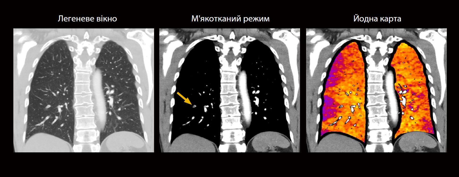Йодні карти демонструють область гіпоперфузії, що вказує на емболію легеневої артерії. Це дозволило швидко ідентифікувати оклюзійний ембол у правому легеневому колі кровообігу на звичайних анатомічних зображеннях за шкалою сірого. Додаткова інформація з йодних карт полегшує швидку та точну діагностику легеневої емболії, потенційно заощаджуючи дорогоцінний час на лікування пацієнта.