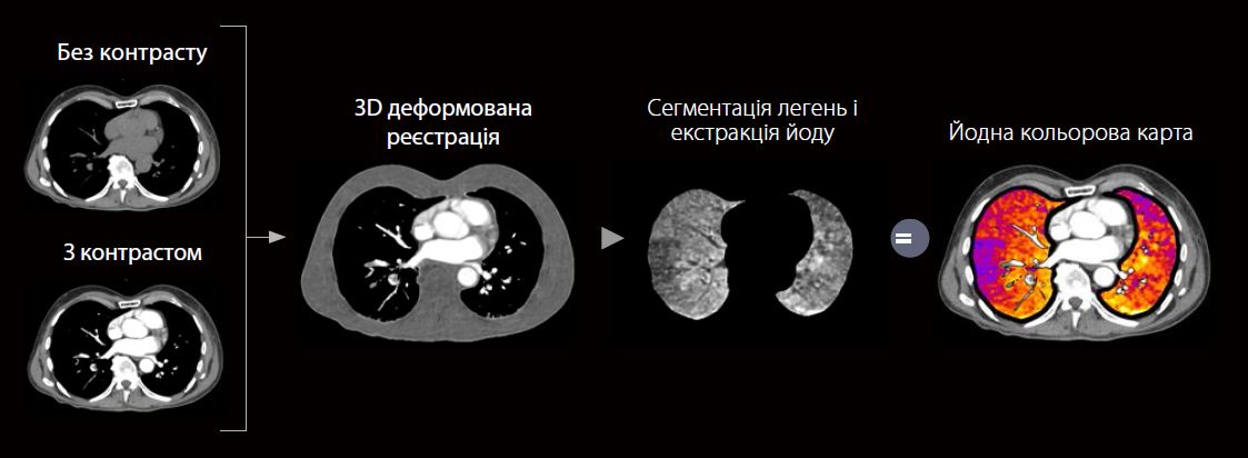 Пацієнт надходить до травмпункту із задишкою. Виконується КТ-ангіографія легеневої артерії (КТЛА). Карти йоду створюються автоматично та надсилаються до PACS для негайного перегляду.
