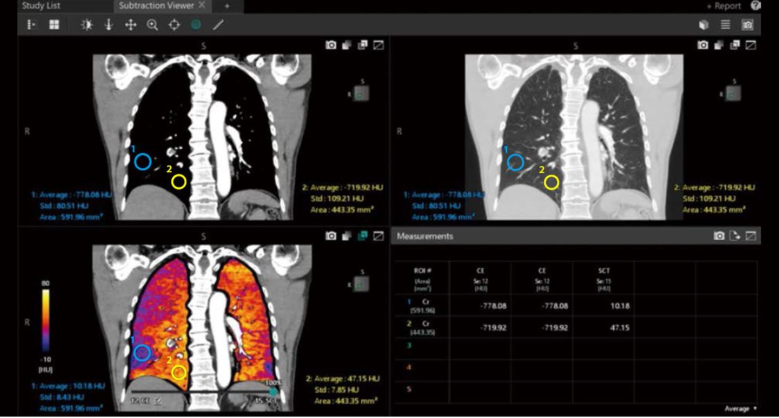 При використанні Subtraction Viewer* також можна інтерактивно прокручувати кольорові карти йоду, синхронізовані із зображеннями у градаціях сірого, для швидкої візуалізації та виявлення ділянок із гіпоперфузією.