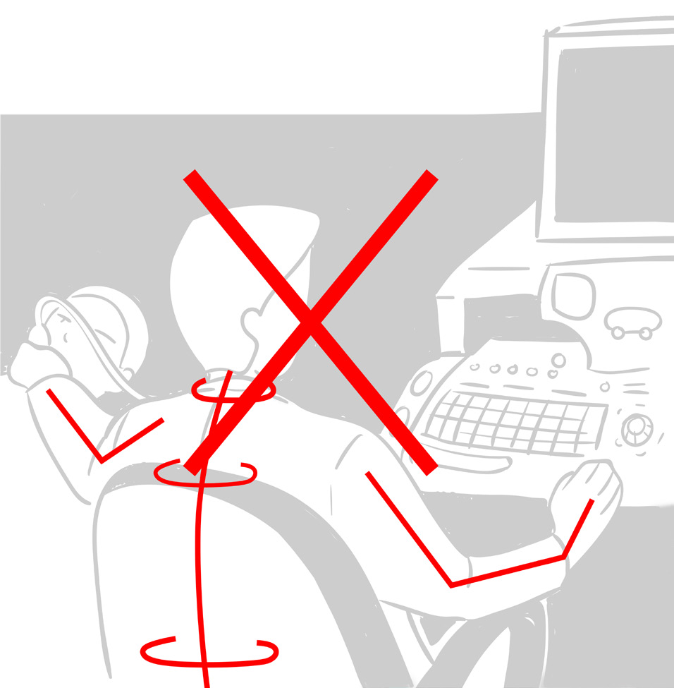 Хоча розташування лікаря відносно системи УЗД є фіксованим, що призводить до статичних положень, важливо, щоб лікар сидів або стояв у нейтральному положенні. Це «нейтральне положення лікаря» починається з прямого, зручного положення тіла – сидячи або стоячи без вигинів шиї чи тулуба, з плечима, розташованими прямо перед монітором. У цьому положенні можна зменшити розгинання рук, відведення та згинання тулуба - найпоширеніші причини болю та травм.