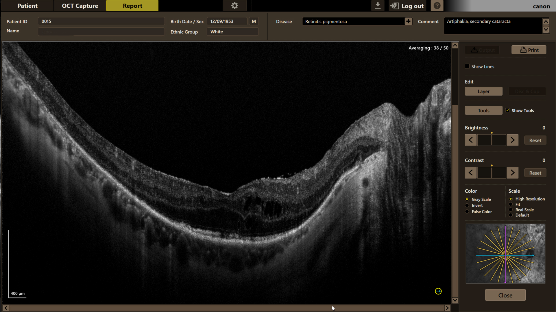 Пігментний ретиніт (пацієнт з артифакією) зображення отримане за допомогою оптичного-когерентного томографа Canon Xephilio OCT A1 (шкала сірого, High Definition)