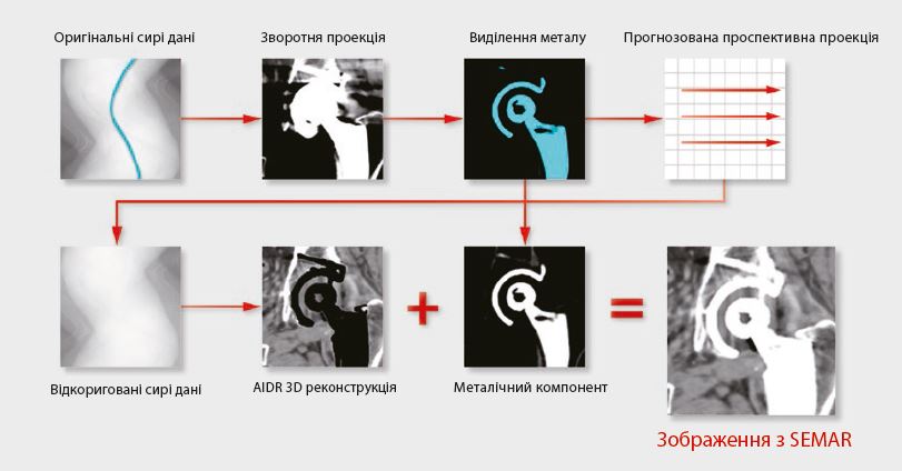 Після цього кроку виправлені необроблені дані реконструюються з адаптивним ітеративним зменшенням дози 3D (AIDR 3D) для отримання набору даних зображення без металевих компонентів і пов’язаних з ними артефактів. Раніше вилучені металеві компоненти далі додаються для створення зображень SEMAR.