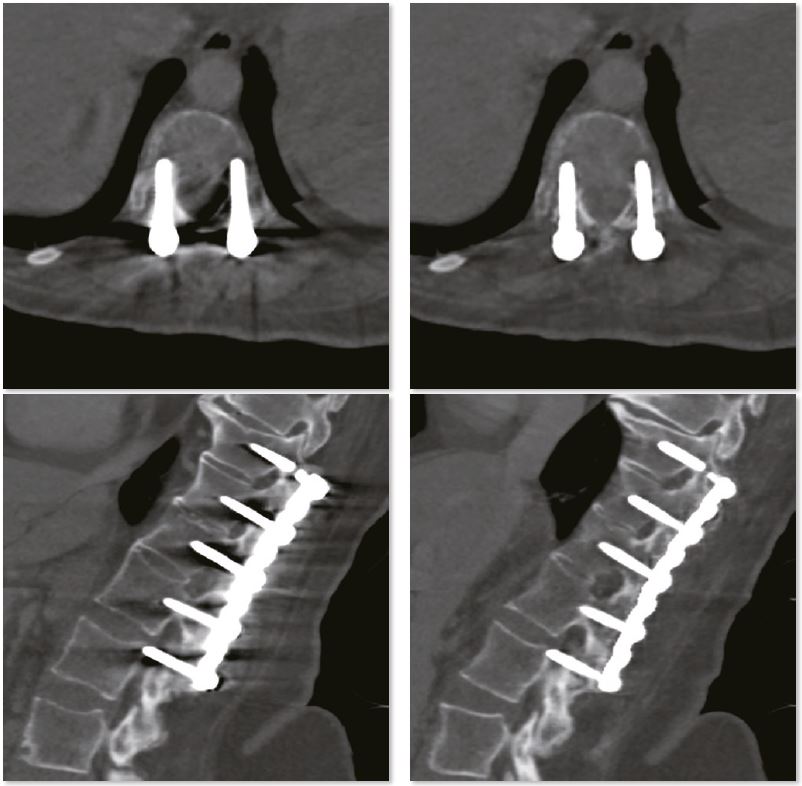 Для стабілізації заднього відділу хребта та збереження хребетного каналу використовується внутрішня фіксація. Зображення SEMAR забезпечують чудову деталізацію хребетного каналу без артефактів. Міжхребцеві дискові простори звужені та дегенеративні в цій частині поперекового відділу хребта