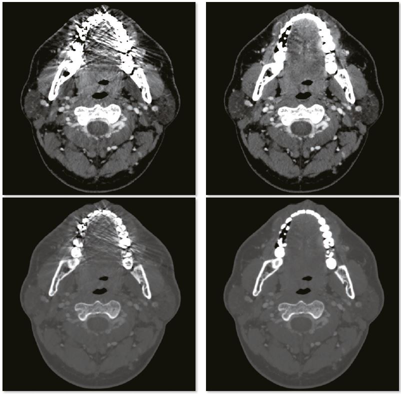 Артефакти з амальгамних пломб повністю усуваються за допомогою реконструкції SEMAR, що дозволяє точно оцінити прилеглі м’які тканини. На цьому постконтрастному скануванні кісток обличчя видно невелику пухлину, яка прилягає до нижньої щелепи.