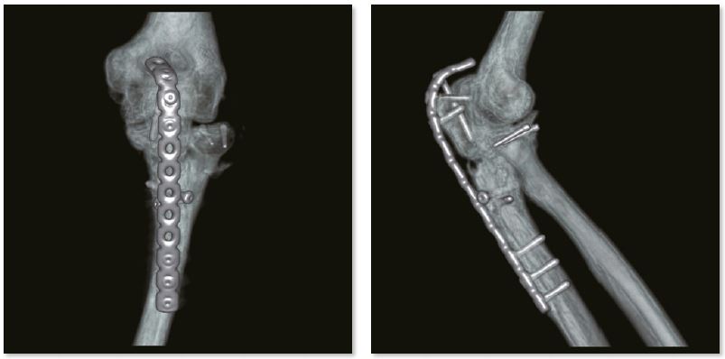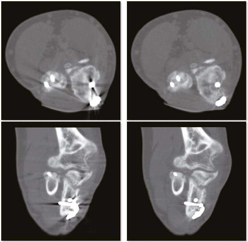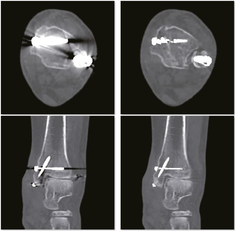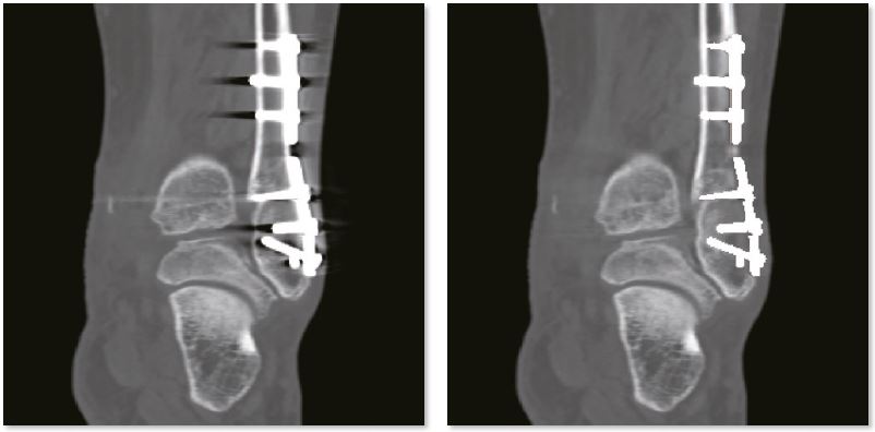 Металеві артефакти більше не є перешкодою для точної післяопераційної оцінки переломів за допомогою пристроїв внутрішньої фіксації. Незрощення перелому проксимального відділу променевої кістки дуже детально показано на реконструкції SEMAR.