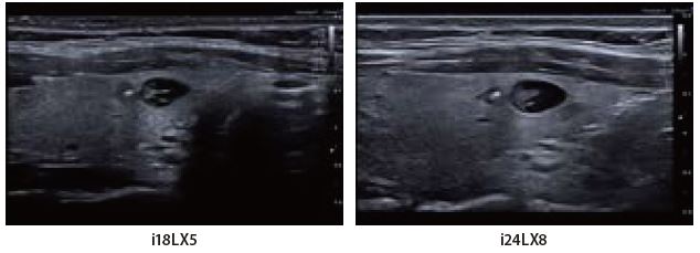 Обидва датчики i-серії добре окреслюють внутрішні структури вузлів щитоподібної залози. Однак у датчика i24LX8 контур і межі меншого вузла чіткіші, і навіть при роботі на дуже високій частоті не відбувається втрати проникаючої здатності. Краща клінічна деталізація може допомогти в діагностиці та поліпшити класифікацію вузлових утворень щитоподібної залози.