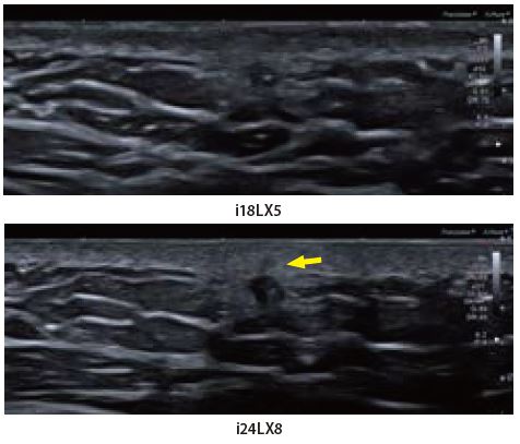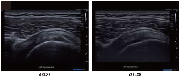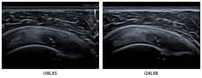 i18LX5 демонструє детальні структури з хорошим проникненням, що дозволяє оператору швидко провести це планове обстеження з високою діагностичною достовірністю. i24LX8 демонструє значно підвищену деталізацію тканин у ближньому полі та достатнє проникнення через все сухожилля надвиросткового м'яза, що дозволяє проводити клінічну діагностику. Ці парні зображення демонструють можливості як i18LX5, так і адекватну глибину проникнення надвисокочастотного датчика i24LX8, що дозволяє використовувати його для загальної візуалізації опорно-рухового апарату.