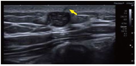 Це невелике підшкірне утворення розміром 3 мм, яке можна легко виявити за допомогою датчика i18LX5. Однак тонкий слід, що веде до шкіри, можна чітко окреслити лише при дослідженні за допомогою i24LX8, що підтверджує наявність кісти сальної залози. Ці парні зображення знову демонструють надвисокочастотний датчик, який забезпечує точність діагностики, що дозволяє виключити будь-які сумніви і уникнути будь-якого підтверджуючого втручання або повторних досліджень. Зверніть увагу на тонку ехогенність навколо цієї крихітної кісти, що вказує на