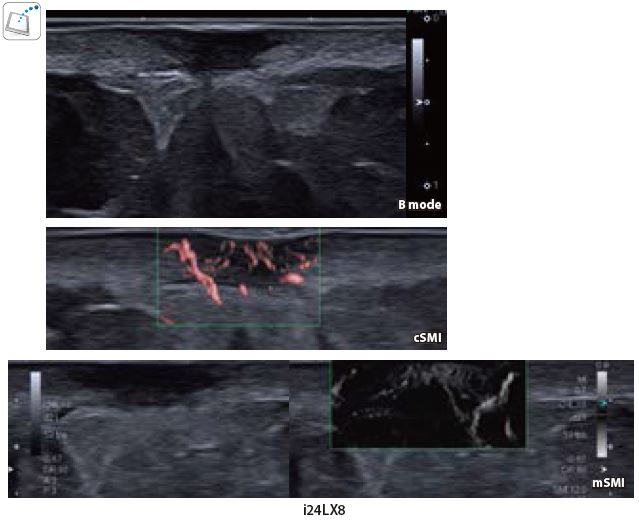 Безпрецедентна якість доплерівського зображення на i24LX8 в ближньому поліпродемонстрована на цій інфікованій злоякісній виразці шкіри. cSMI і mSMI відображає розгалужену багату гіперваскулярну мережу капілярів з високою роздільною здатністю, яка не може бути виявлена при більш низькій частоті.