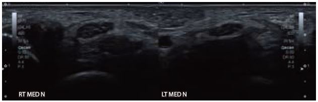 Цей випадок демонструє потовщення правого серединного нерва порівняно з лівим серединним нервом на рівні згинача сітківки, що свідчить про синдром правого карпального каналу.