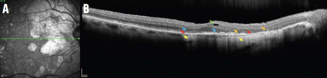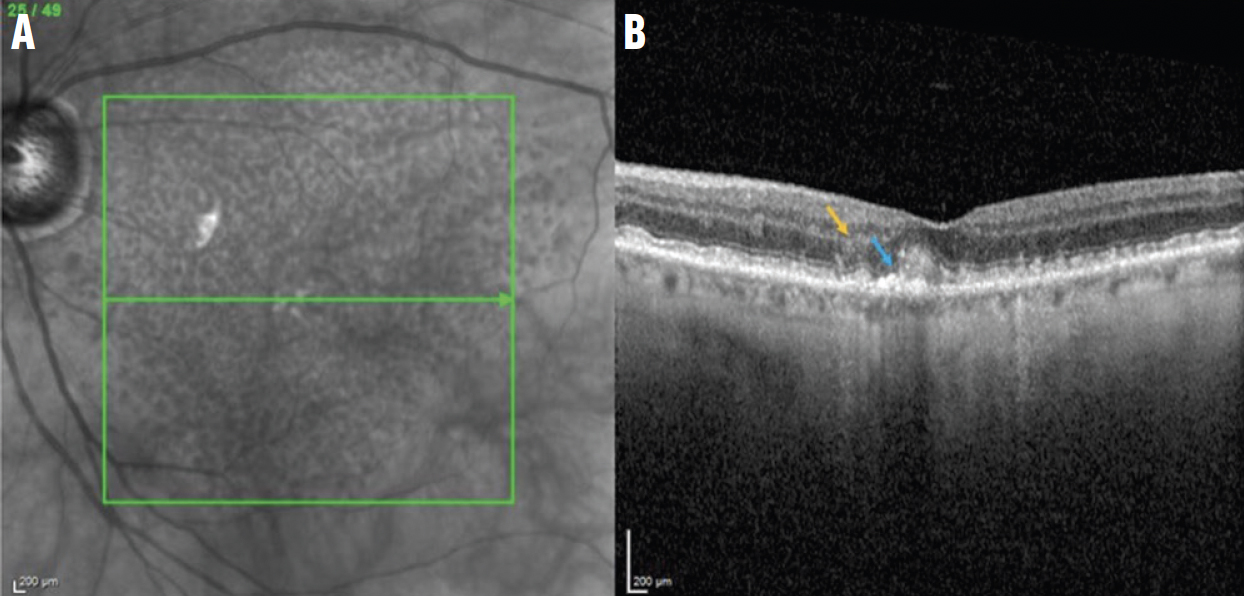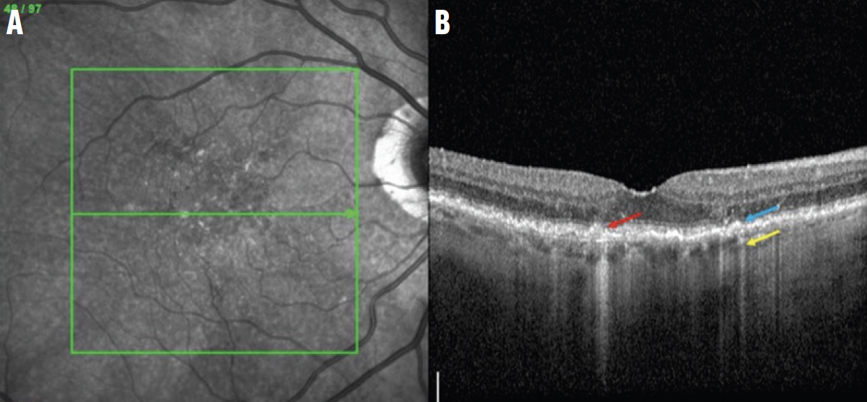 Рис. 3. NIR зображення (A) та В-скан ОКТ iRORA ураження (B) відображають порушення ELM та EZ (сині стрілки) та вогнищеве зменшення RPE (червона стрілка) з гіпертрансмісією в хоріоїдею (жовта стрілка).