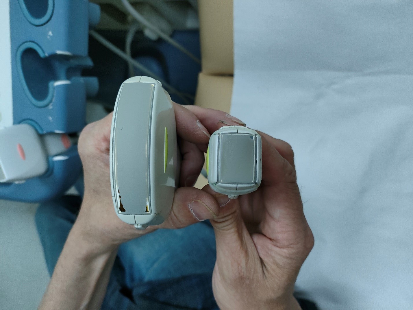 Конвексний датчик на фото 1 зліва має значні пошкодження акустичної лінзи, які призводять до порушення електробезпеки. При використанні такого датчика пацієнт або лікар можуть отримати ураження електричним струмом. Герметизація тимчасово вирішує дану проблему, але в подальшому такий датчик рекомендується замінити.