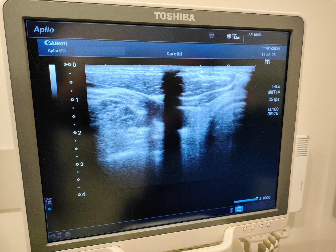 На фото 2 видно здуття на акустичній лінзі лінійного датчика. Такі здуття з’являються внаслідок порушення герметичності датчика і потрапляння вологи або гелю під поверхню акустичної лінзи. Дана несправність призводить до появи на УЗ-зображенні досить широкої «мертвої зони» (фото 3), яка значно погіршує якість та діагностичну достовірність зображення. На жаль така несправність не ремонтується і датчик рекомендується замінити.