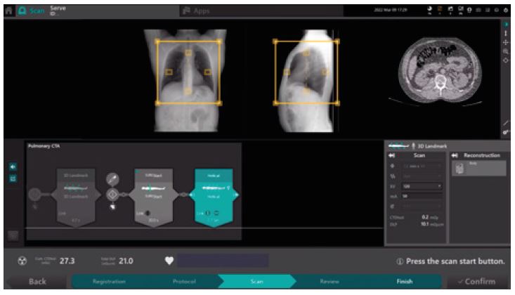 Це, у поєднанні з виявлен-ням анатомічних орієнтирів (Anatomical Landmark Detection), може точно ідентифікувати анатомічні структури, необхідні для виконання автоматичного планування сканування для всіх рутинних обстежень. Крім того, діапазон сканування та поле зору можуть бути автоматично встановлені в положення, яке попередньо визначено в протоколі сканування, щоб заощадити час, забезпечуючи при цьому узгоджені результати для всіх клініцистів.