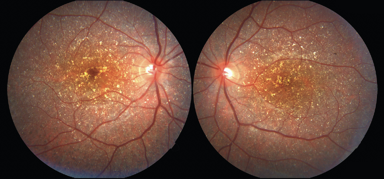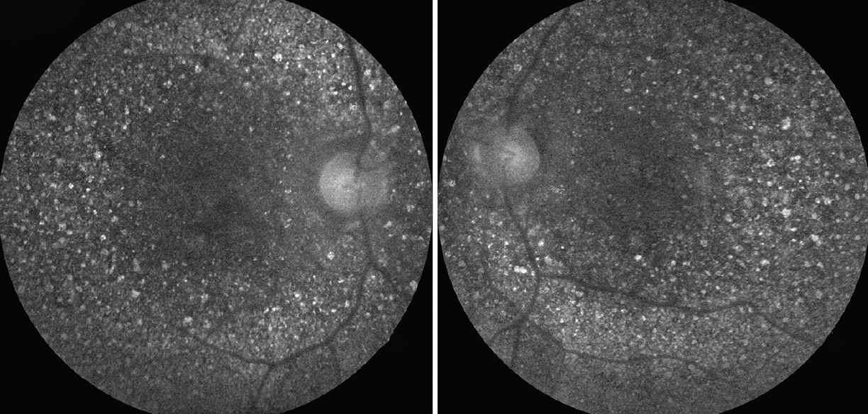 Дослідження переднього сегмента кожного ока не було значимим. Кольорова фотографія очного дна виявила дифузні блискучі жовто-білі кристалічні відкладення на задньому полюсі сітківки кожного ока (рис. 1). Автофлуоресценція очного дна (FAF) також показала гіперфлуоресцентні відкладення на задньому полюсі кожного ока (рис. 2)