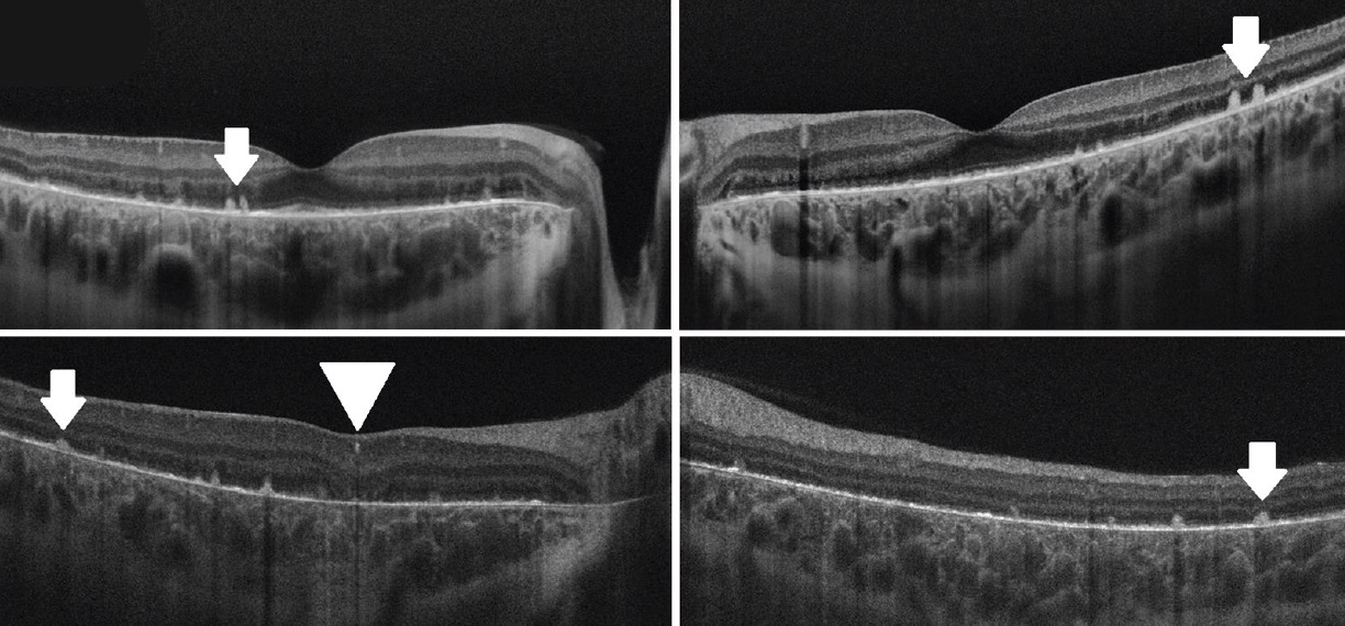Оптична-когерентна томографія (ОCT) виявила плями гіперрефлексії (рис. 3, біла стрілка) у внутрішніх шарах сітківки, яскраві світловідбиваючі відкладення (біла стрілка) зверху пігментного епітелію сітківки (RPE) – на мембрані Бруха та відсутність зовнішніх канальців сітківки в кожному оці. Порушення еліпсоїдної зони та пігментного епітелію сітківки було більш помітним на парафовеальних зрізах ОCТ. Наявність помітних кристалічних відкладень на сітківці разом із результатами FAF та ОCТ привели до рішення, що діагнозом є рання стадія кристалічної дистрофії Б’єтті (BCD).