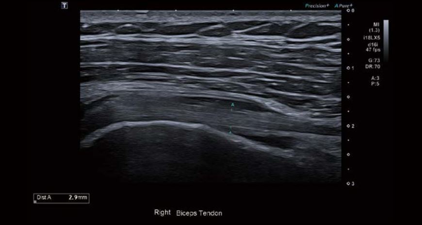 Зображення 1 Поперечне зображення сухожилля біцепса з використанням iBeam+ та Full Focus - видно рідину в оточуючій оболонці.