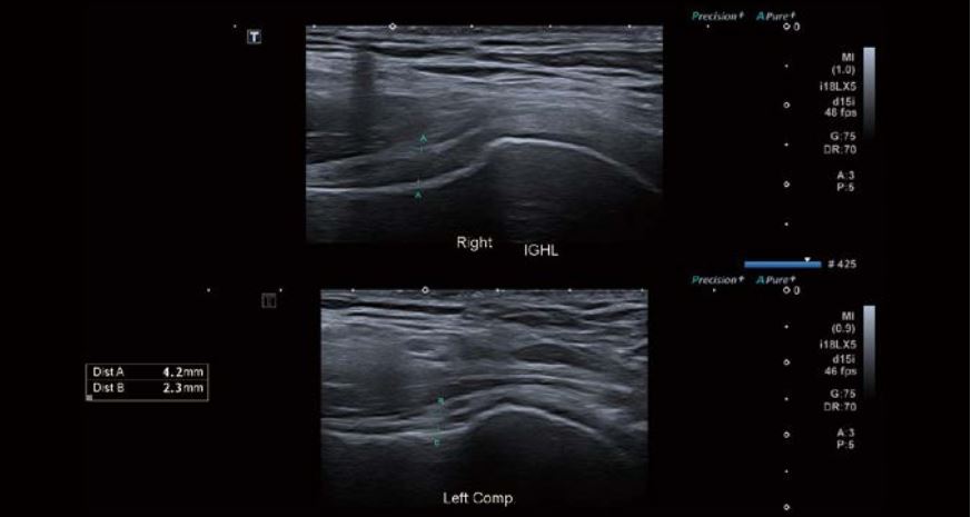 Зображення 2 Подвійний екран Canon демонструє, що IGHL дещо товстіша справа порівняно з безсимптомним лівим боком.