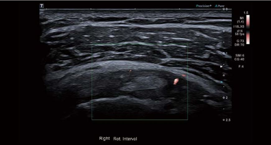 Зображення 3 Видно потовщення ділянки обертальної манжети, а режим Superb Micro-vascular Imaging (SMI) демонструє наявність судин