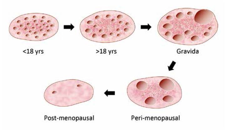 Ультразвукові властивості яєчників значно варіюються відповідно до морфологічних змін, що відбуваються залежно від віку та кількості пологів. Анатомічні висновки, отримані в результаті масштабного спостережного дослідження, проілюстровані на рисунку 2.