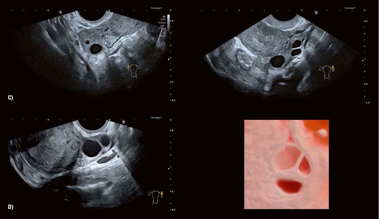Рис. 3 A: 3D анатомічні площини показують типову мультифолікулярну природу структури фолікулів яєчників у віковій групі від раннього до середнього та пізнього підліткового віку.