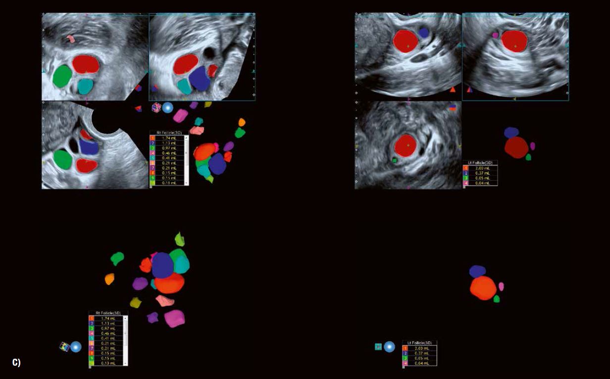 Рис. 5 C: Автоматичне вимірювання об'єму фолікулів із функцією кольорового кодування має очевидну перевагу з точки зору моніторингу циклів допоміжних репродуктивних технологій що забезпечує дуже ефективну оцінку кількості фолікулів, а також їх зростання.