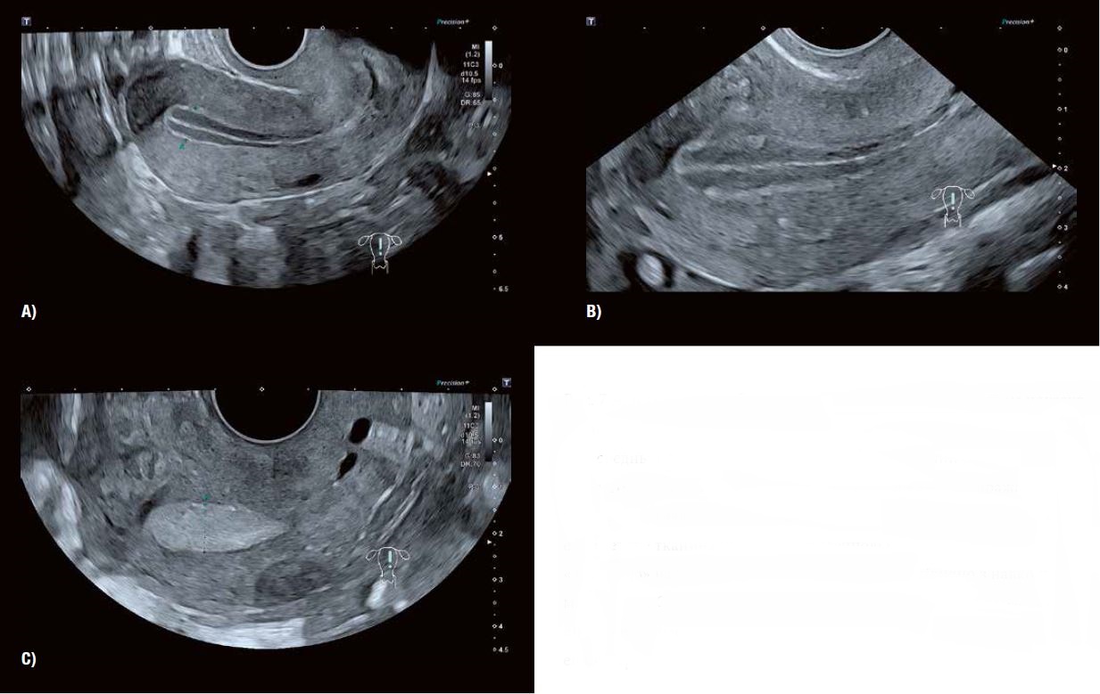 Рис. 7 A, B і C: Серія зображень втрансвагінальним датчиком показує характерні зміни в зовнішньому вигляді ендометрію під час переходу від середньої фази проліферації (A) до фази овуляції (B) і ранньої фази жовтого тіла (C). Зміна характеристик сірої шкали відображає стадії проліферації залоз у стромі ендометрію. У міру збільшення залоз ендометрію тканина стає більш ехогенною і «яскравою» на ультразвуковому зображенні порівняно з навколишнім міометрієм. Сучасна візуалізація трансвагінальним датчиком у сірій шкалі виключає термін «тришаровий» для опису циклічного розвитку ендометрі.