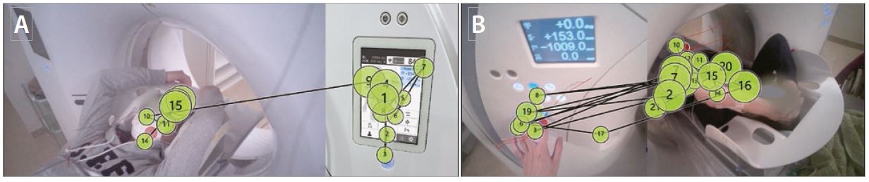 Тематичні дослідження відстеження очей показали, що позиціонування пацієнта за допомогою камери зберігає фокус оператора на пацієнті та забезпечує комфорт пацієнта. У наведеному нижче прикладі (Рисунок 3) оператор може утримувати свою увагу на пацієнті, а не чергувати фокус між панеллю гентрі та пацієнтом. Розмір кола вказує на час, витрачений на погляд на точку. У A з INSTINX оператор дивиться на сенсорну панель, а потім переходить до пацієнта, не повертаючись до сенсорної панелі. У B користувач неодноразово дивиться між кнопками та пацієнтом під час позиціонування.