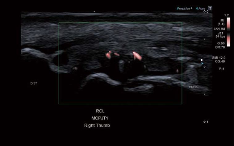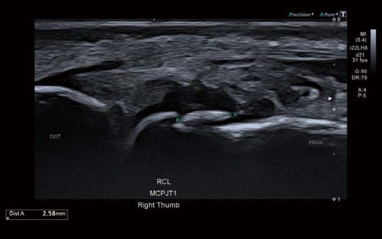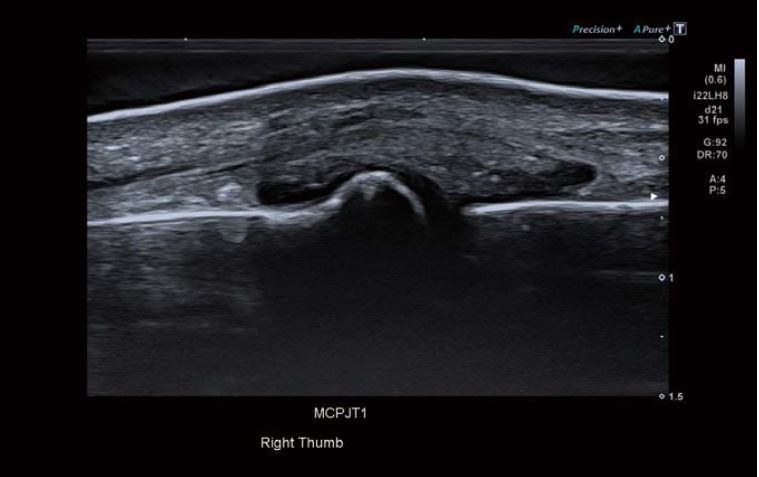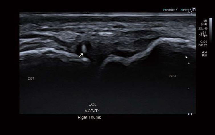 Ультразвукове дослідження проводилося за допомогою системи Canon Aplio i800 / Prism Edition з використанням надвисокочастотного датчика «хокейна ключка» (PLI-2002BT) з частотою 22 МГц. Було виявлено розрив променевої колатеральної зв'язки (ПКЗ) на всю товщину та осколковий перелом першого п'ястково- фалангового суглоба. Ультразвукові дані також вказували на частковий розрив ліктьової колатеральної зв'язки (ЛКЗ).