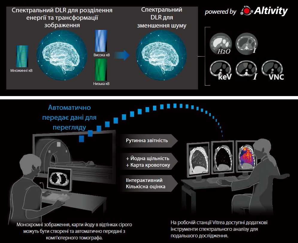 Технологія Spectral CT від Canon поєднує швидке перемикання kV і модуляцію mA, що адаптується до конкретного пацієнта, з технологією Deep Learning Reconstruction (DLR). DLR обробляє необроблені дані з різною енергією, забезпечуючи точне розділення енергії та зменшення шуму, що дає чіткі спектральні зображення. Отримані дані можна надсилати безпосередньо до PACS, а розширений аналіз зображень можна виконувати за допомогою програми Spectral Analysis на платформі Vitrea.