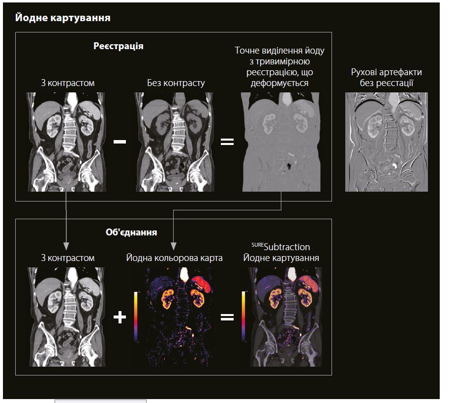Реконструйовані йодні зображення накладаються на постконтрастне зображення як шар йодного кольору. Карти йоду, отримані за допомогою КТ-субтракції, покращують візуалізацію йоду, що може призвести до більш якісної діагностики.