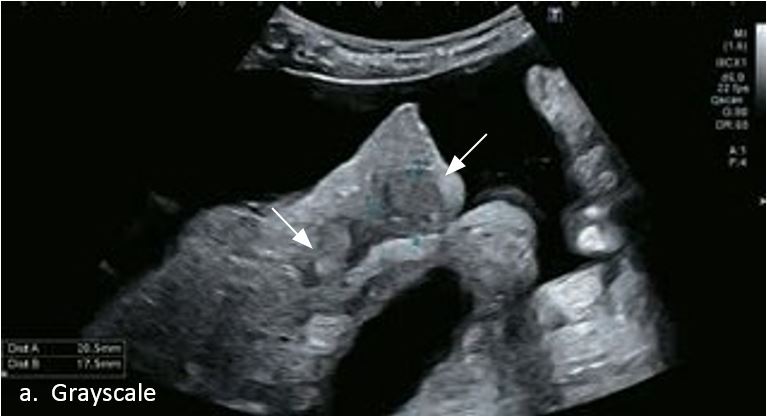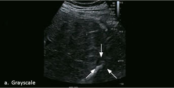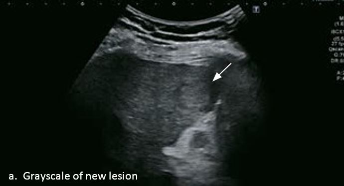 Це випадок 60-річної жінки з декомпенсованим цирозом печінки з асцитом. На сірошкальному зображенні можна виявити два вогнищевих ураження, розміром 21 мм і 10 мм відповідно, розташовані в сегменті 5. Оскільки дослідження методом зсувної хвилі на апараті Canon виконується штовхаючим імпульсом, пацієнтам з асцитом не можна проводити дослідження за допомогою зсувної хвилі, для визначення стадії фіброзу. На ранній артеріальній стадії гомогенне гіперехогенне підсилення спостерігається в обох ураженнях. Ураження є ізоехогенними в портальній венозній та пізній фазах, вимивання не спостерігається через 6 хвилин після ін'єкції, тому ці ураження були класифіковані як LI-RADS 4, ймовірна ГЦК. Важливо знати, що LI-RADS 5 - це ГЦК зі 100% вірогідністю, і вона не потребує біопсії. Значна кількість LI-RADS M (ймовірно або точно злоякісні, але не специфічні для ГЦК) і LI-RADS 4 (ймовірна ГЦК) насправді являються ГЦК.