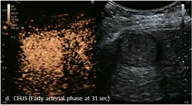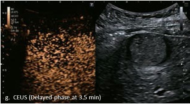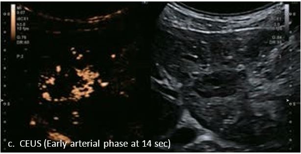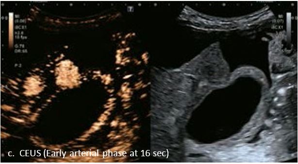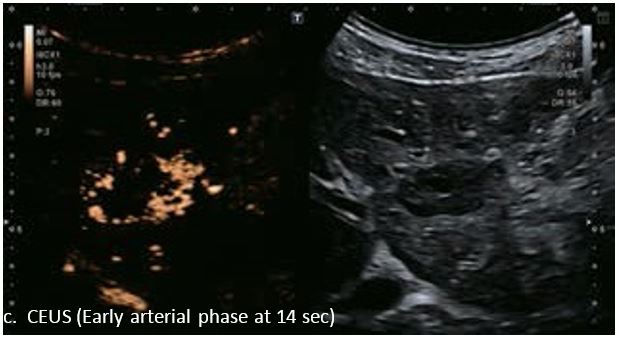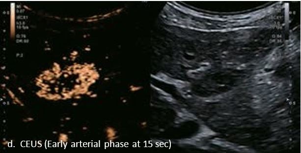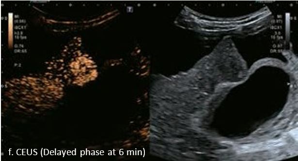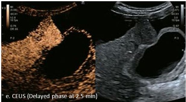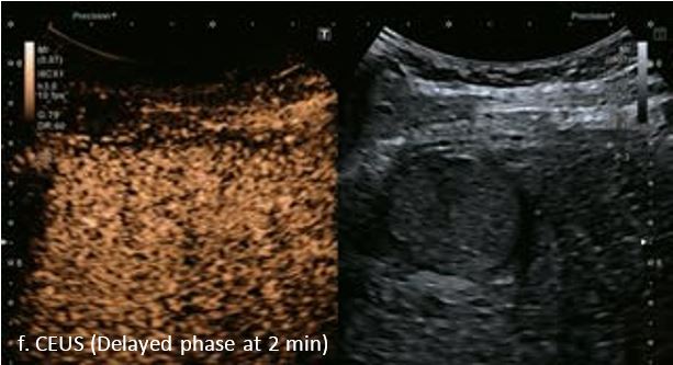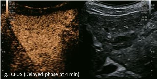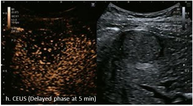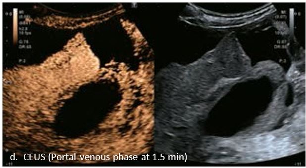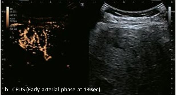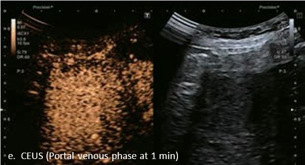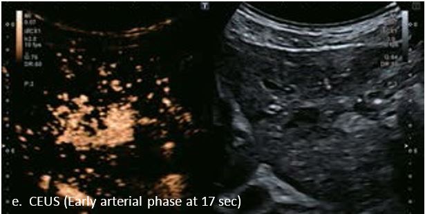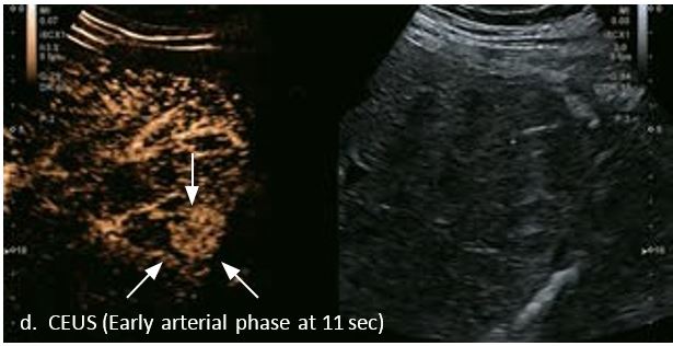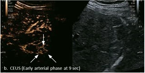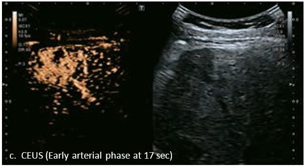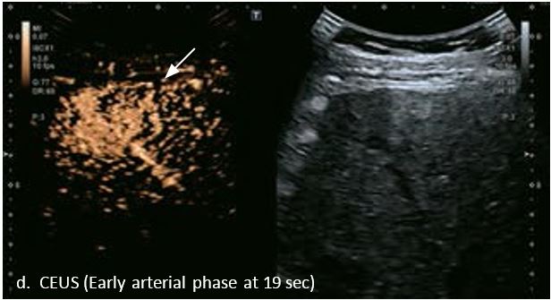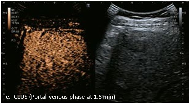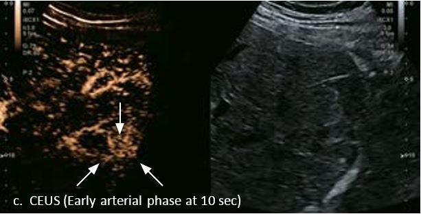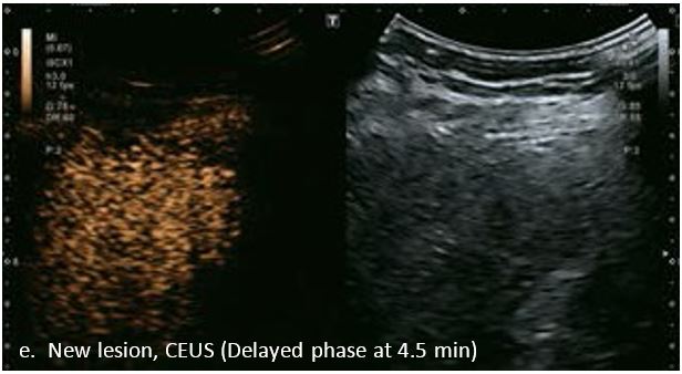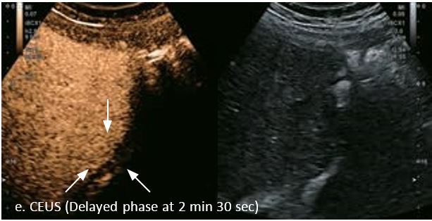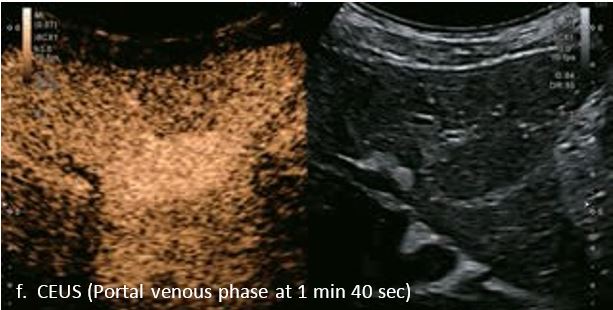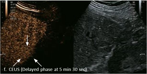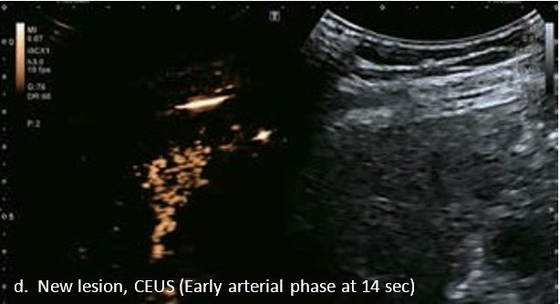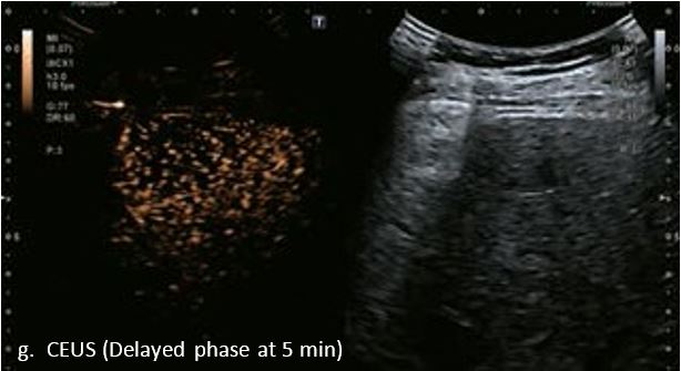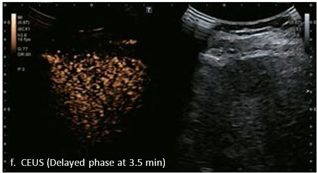 У 70-річної жінки з цирозом печінки, хворої на вірусний гепатит С, у правій частці печінки виявлено вогнище ураження розміром 23 мм. Детальна судинна структура та підживлююча судина чітко візуалізуються за допомогою CEUS на ранній артеріальній фазі та під час портальної венозної фази, а ураження є ізопідсилюючим. Це ураження є типовим для LI-RADS 5 за своїм розміром, гіперпосиленням в артеріальній фазі та пізнім і помірним вимиванням, що спостерігається через 3 хвилини після ін'єкції.