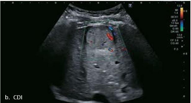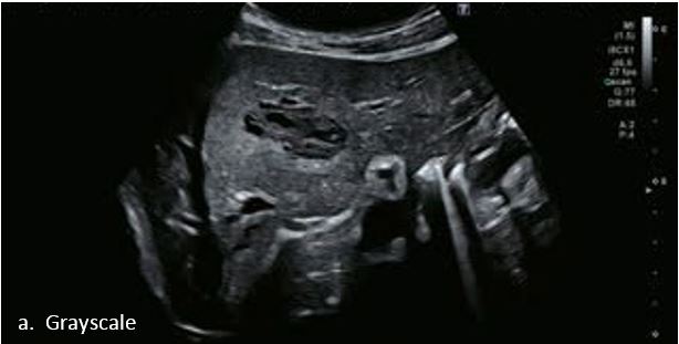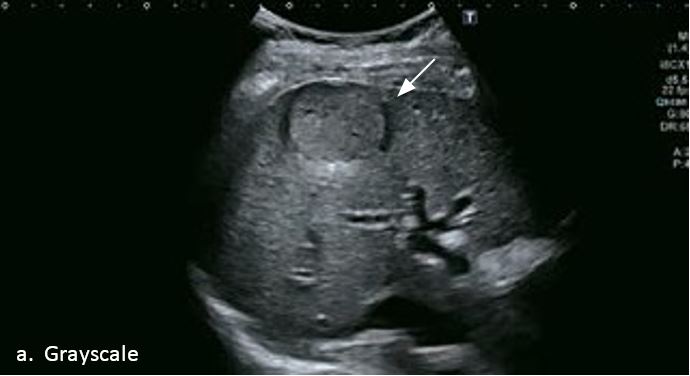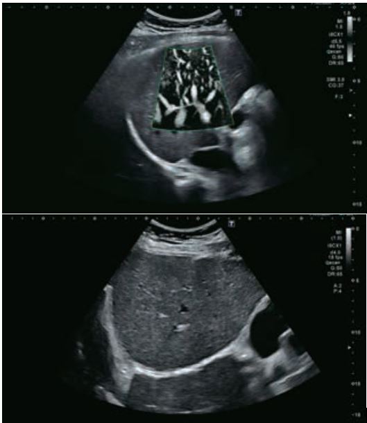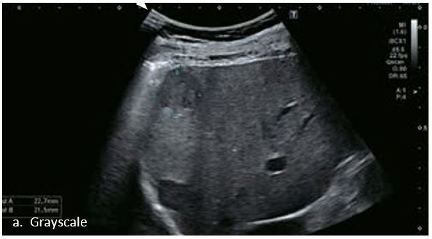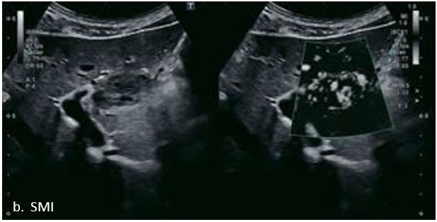 Гемангіома є одним із найпоширеніших доброякісних уражень печінки. На сірошкальному зображенні 50-річного чоловіка видно гетерогенне гіпоехогенне утворення в лівій частці печінки, розміром 3,6 см в діаметрі. На сірошкальному зображенні чітко видно межі та внутрішню структуру вогнища ураження. За допомогою SMI низькошвидкісні дрібні судини всередині вогнища можна візуалізувати з високою частотою кадрів (47 кадрів/с), а вогнище демонструє високу васкуляризацію. Вогнищеві ураження печінки чітко видно на неконтрастному УЗД з гарною якістю зображення. Васкуляризацію можна оцінити до певної міри. Однак діагноз не може бути поставлений без використання контрастної речовини. Це не є винятком для КТ чи МРТ, обидва методи потребують багатофазної візуалізації з введенням контрасту для постановки діагнозу.