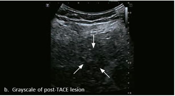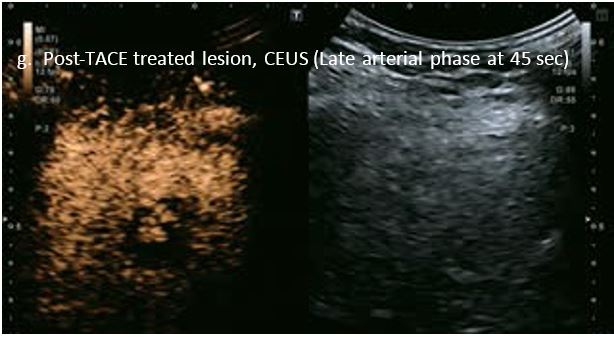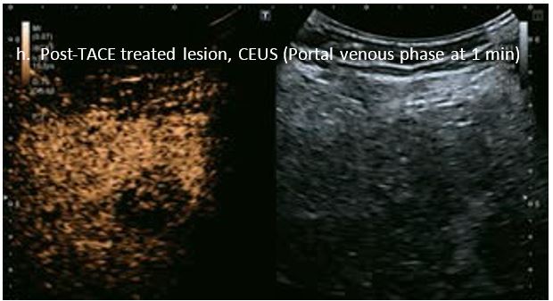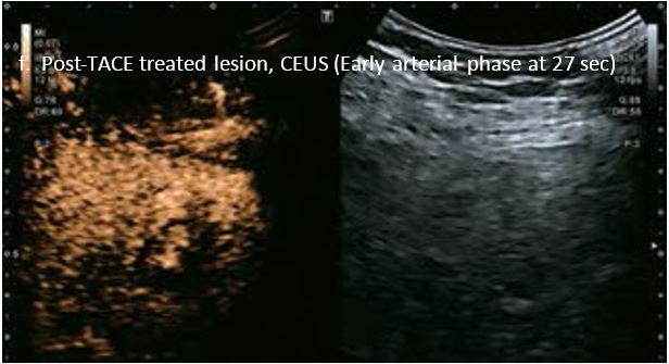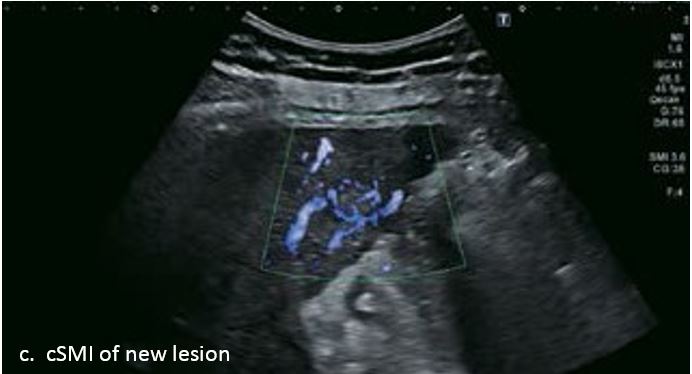 Проведено повторне обстеження 79-річного чоловіка з цирозом печінки В, ускладненим ГЦК, після транс-артеріальної хіміоемболізації (ТАХЕ). Було виявлено нове ураження, розташоване поруч з ураженням після ТАХЕ. На сірошкальному зображенні чітко видно нове ураження, але складно виявити рецидив ГЦК в зоні ураження після ТАХЕ. За допомогою кольорового картування SMI (cSMI) можна побачити розвинену судинну мережу всередині нового вогнища ураження. Для оцінки результату лікування було виконано CEUS. За допомогою CEUS можна легко дослідити як нове ураження, так і рецидив ГЦК у вогнищі ураження після TACE. Нове ураження демонструє гіперпосилення артеріальної фази і відсутність вимивання до 5 хвилин, отже, це ураження LI-RADS 4, ймовірна ГЦК за критеріями LI-RADS. Підживлюючі судини можна чітко спостерігати в ранній артеріальній фазі. Для ураження після TACE, більша його частина не підсилюється, однак, в артеріальній фазі спостерігається ділянка гіперпосилення у верхній частині лікованого ураження, що вказує на рецидив ГЦК.