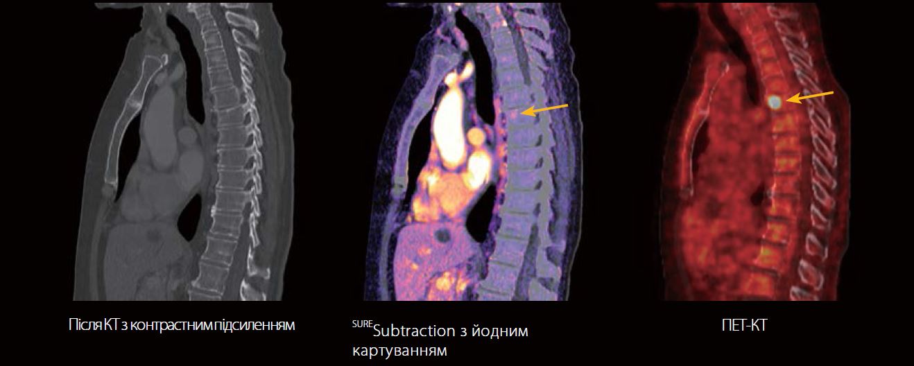 Реконструкція кістки та SURESubtraction з йодним картуванням були виконані автоматично після сканування. На сагітальному знімку йодних карт чітко видно метастаз (помаранчева стрілка) у грудному відділі хребта, який не було візуалізовано на кістковій реконструкції після КТ з контрастним підсиленням. Метастази були підтверджені за допомогою ПЕТ-КТ.