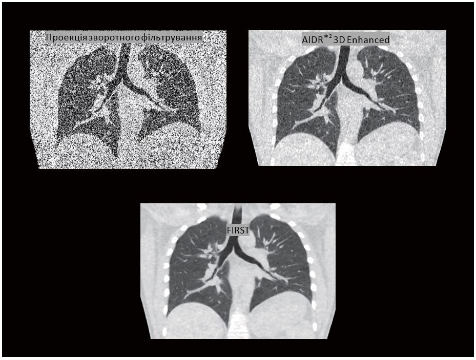 реконструкції, що базується на прогнозованій моделі FIRST дозволяє нам знизити отримувану пацієнтом дозу до найнижчих рівнів зі збереженням діагностичної якості. Таким чином доза при дослідженні органів грудної порожнини стає подібною до рентгенографії легень.”