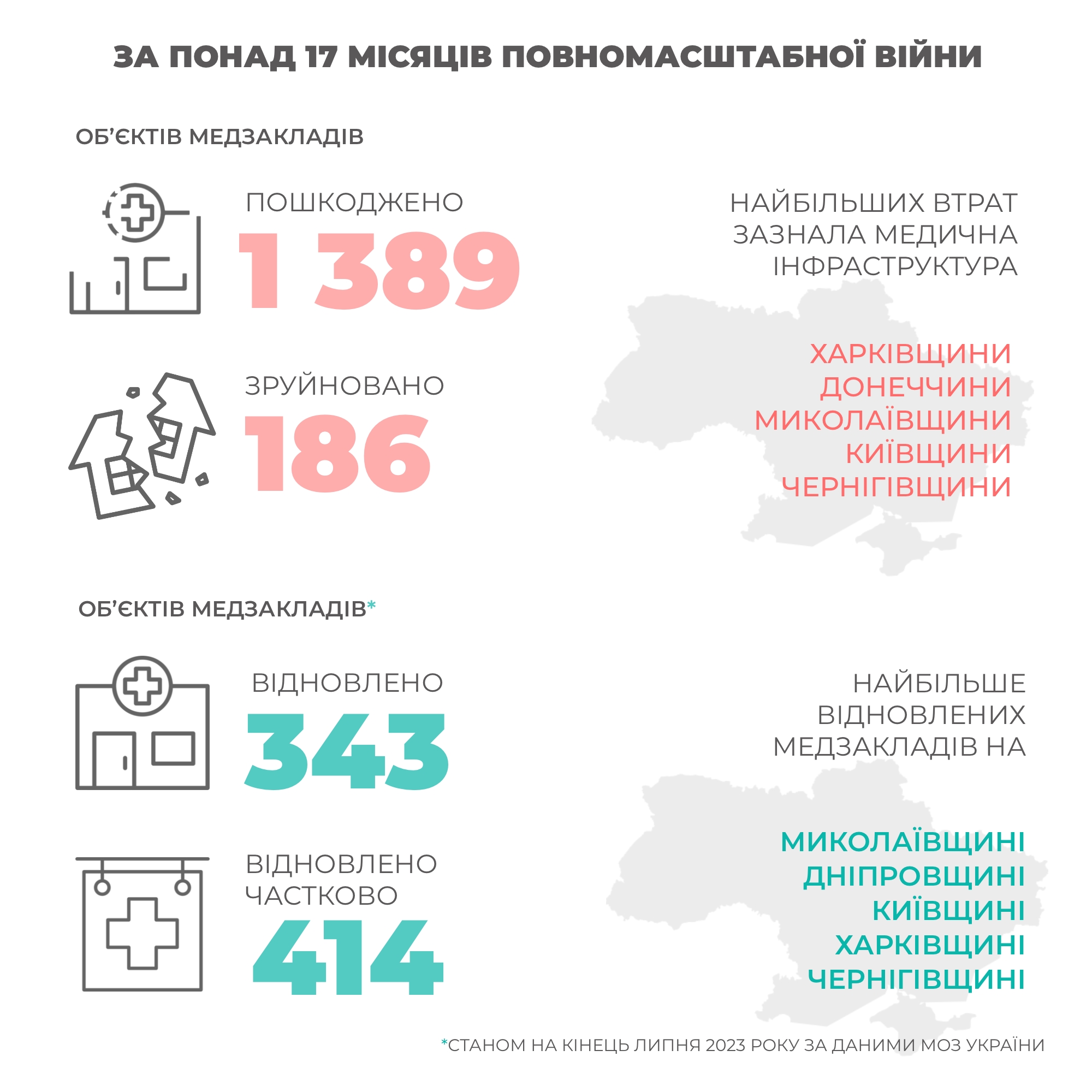 Станом на кінець липня 2023 року вдалося повністю відновити 343 об’єкти медзакладів, ще 414 об’єктів – відновлено частково. Найбільше відновлення на Миколаївщині, Дніпровщині, Київщині, Харківщині та Чернігівщині.