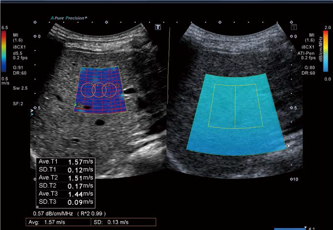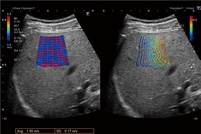 Коли ожиріння печінки прогресує до цирозу, кількість жиру фактично зменшується, що може помилково вважатися ознакою клінічного поліпшення. Ось чому важливо оцінити жорсткість тканини печінки за допомогою SWE. У Aplio a ATI (для вимірювання жирових змін) і SWE (для вимірювання фіброзних змін) можна виконати за допомогою однієї кнопки, і немає необхідності змінювати датчики.