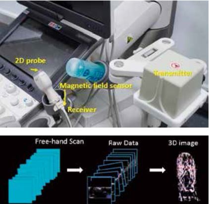Smart Sensor 3D - це новітня технологія об'ємного сканування. Зображення, отримані шляхом сканування "вільною рукою" за допомогою 2D-датчика, об'єднуються для створення 3D-зображень високої чіткості з точною позиційною інформацією, отриманою за допомогою магнітного поля від датчика (Рис. 1).