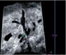 При оцінці ступеня інфільтрації холангіокарциноми на 3D-реконструкціях неможливо візуалізувати суцільність жовчної протоки на одному зображенні в С-площині (рис.5б). Однак, простеживши додаткові точки в просвіті і відобразивши їх за допомогою Curved MPR, можна сформувати вигнуту С-площину. У вигнутій С-площині (рис.5в) можна чітко візуалізувати безперервність жовчної протоки, що дозволяє легко оцінити ураження та прилеглі ділянки. Крім того, Shadow Glass (Рис. 5г) дозволяє відобразити задню стінку, що дає змогу чіткіше спостерігати за всією структурою жовчної протоки.