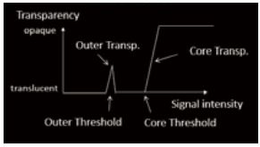 Рисунок 3. Візуалізація плоду з використанням візуалізації об'єму (a), яскравості ( б) та Shadow Glass ( в).