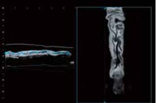 Крім того, використання вигнутої С-площини, створеної OmniView (рис. 4б), дозволяє зобразити кровоносні судини в пальцях безперервно. Таким чином, цілісність кровоносних судин можна оцінити, використовуючи як 3D Shadow Glass (рис. 4в, г), так і 2D вигнуту С-площину. Планується, що ці зображення виявляться корисними в широкому спектрі клінічних досліджень, таких як мікрохірургія.