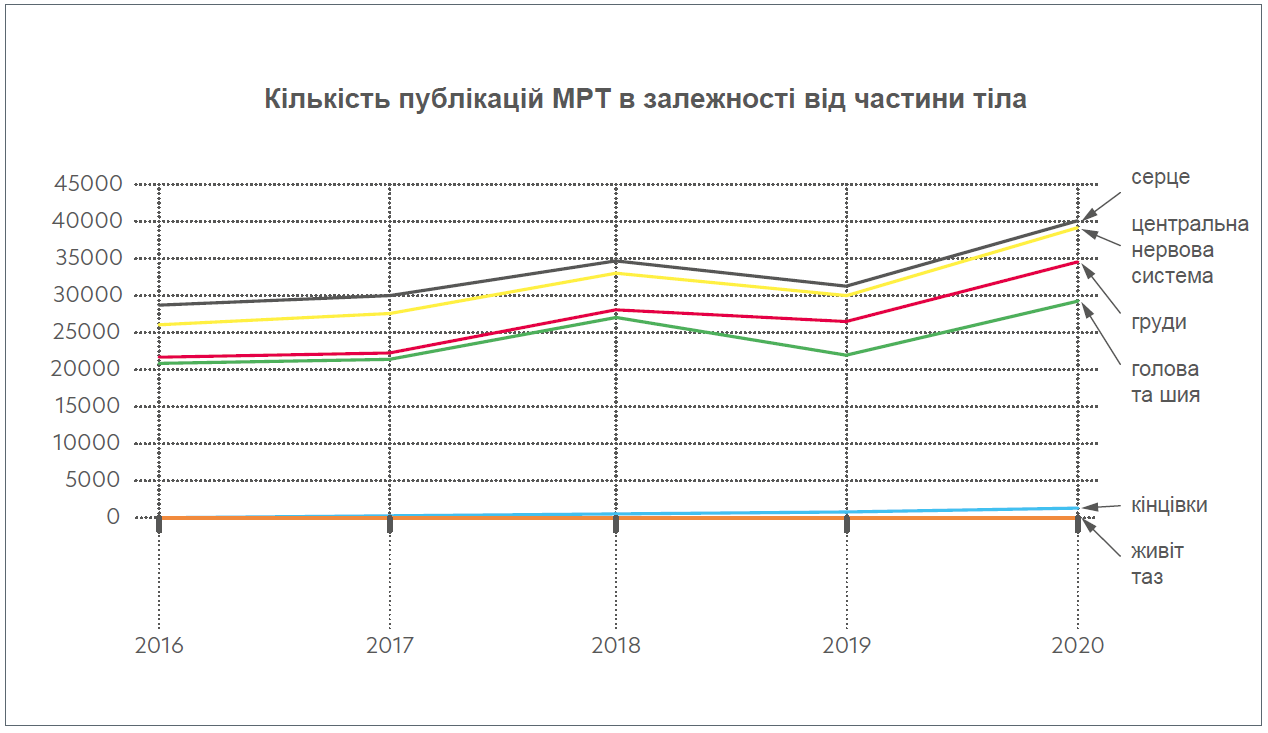 Іншим цікавим індикатором для спостереження є кількість публікацій з МРТ досліджень різних частин людського тіла. Ці тренди показують зацікавленість вчених і не завжди корелюють з найбільш досліджуваним органом в щоденній медичній практиці.