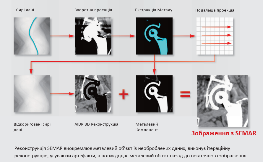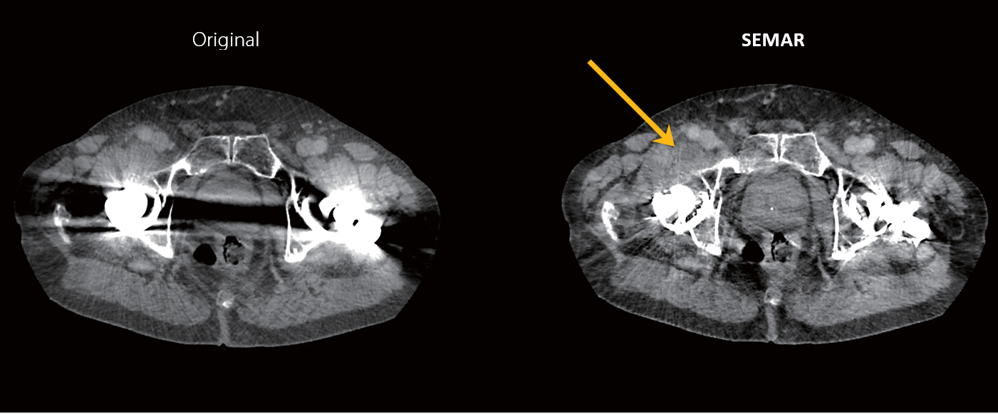 Реконструкція з SEMAR дозволяє знизити артефакти від металу, що дозволяє діагностувати патологію, що не візуалізується під час звичайної КТ-реконструкції.
