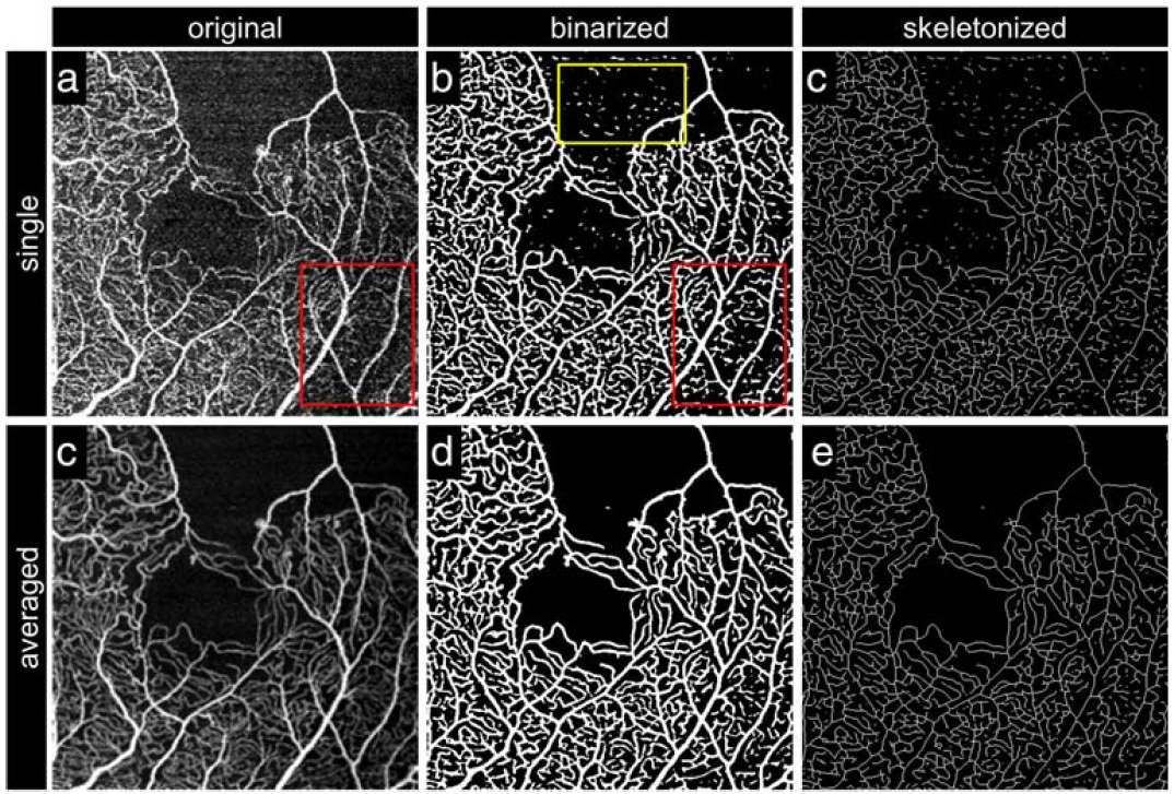 Рис. 1 Бінаризація та скелетонізація ОКТА зображень ока з оклюзією гілки вени сітківки до та після усереднення зображень (A, B). ОКТА зображення макули площиною 3 × 3 мм з центром на жовтій плямі. Усереднене ОКТА (B) зображення згенеровано з десяти ОКТА сканів, що показують кращу суцільність судин з меншим фоновим шумом ніж одне зображення (A). Ділянка неперфузії в одиничному ОКТА зображенні (обведена червоним) при усередненні виглядає ділянкою з перфузією. Бінаризовані зображення (B, D) та скелетовані зображення (C, E) генеровані з одиночного ОКТА зображення (верхній ряд) показували збільшення білих пікселів в зоні неперфузії (обведена жовтим) та зменшення пікселів в зоні перфузії (обведена червоним) в порівнянні з бінаризованим зображенням з усередненого ОКТА зображення (D)