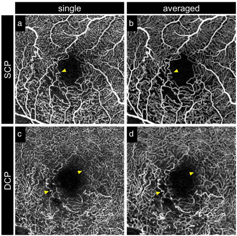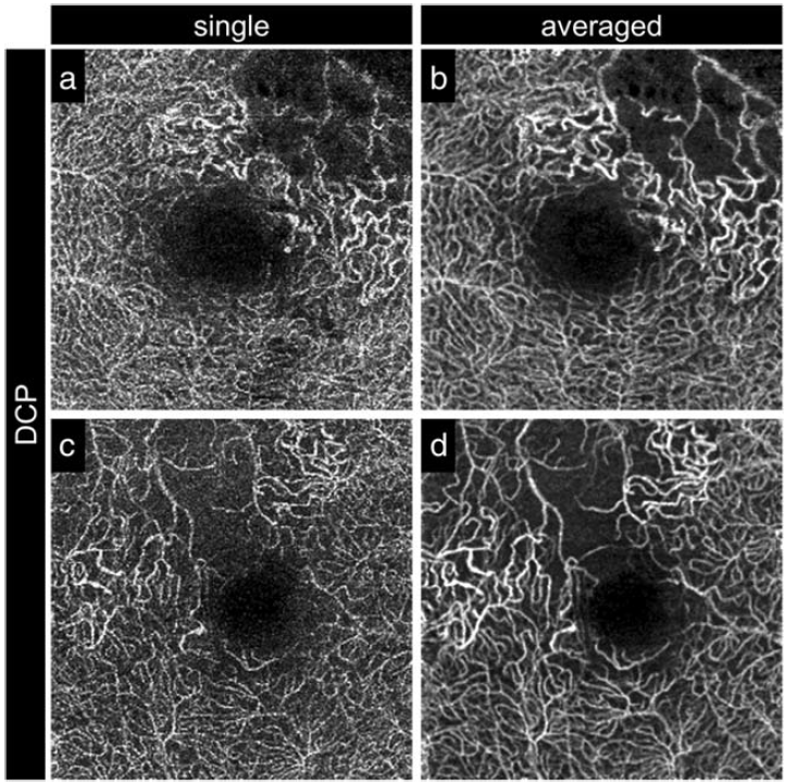 Макулярні зображення OКTA 33 очей 33 пацієнтів з BRVO були отримані за допомогою оптичного когерентного томографа Canon. Для кожного ока було отримано п’ять сканувань OCTA за допомогою протоколу 3 × 3 мм, дані були усереднені та об’єднані в єдині дані зображення високої якості за допомогою програмного забезпечення. Зображення до та після усереднення якісно та кількісно порівнювали на рівнях поверхневого капілярного сплетіння (SCP) та глибокого капілярного сплетіння (DCP).