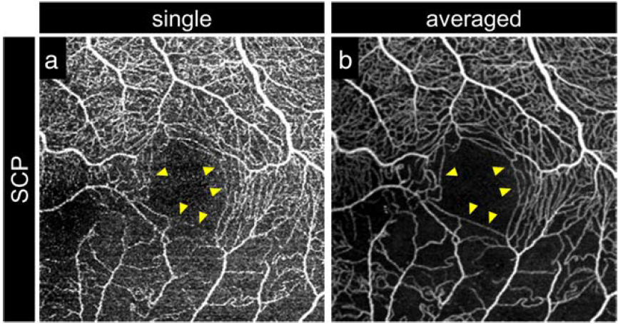 Деякі очі показали вигляд судин які формували цілісний кордон FAZ після усереднення. Оскільки мікросудинний кровотік виявився пульсуючим та демонструє коливання на рівні парафовеальної капілярної мережі при спостереженні за допомогою адаптивної оптики та враховуючи той повільний кровоток, який не дає різниці у відбивальній здатності між ОКТ скануваннями в час між скануванням, ОКТА не може бути виявлено потік крові, одиночне ОКТА може не виявити повільний потік крові, особливо у випадках BRVO. Захоплення декількох ОКТА допомагає уловити сигнал потоку в різних точках и усереднення зображень ОКТА можуть мати переваги для отримання структурної картини мікроциркуляції.