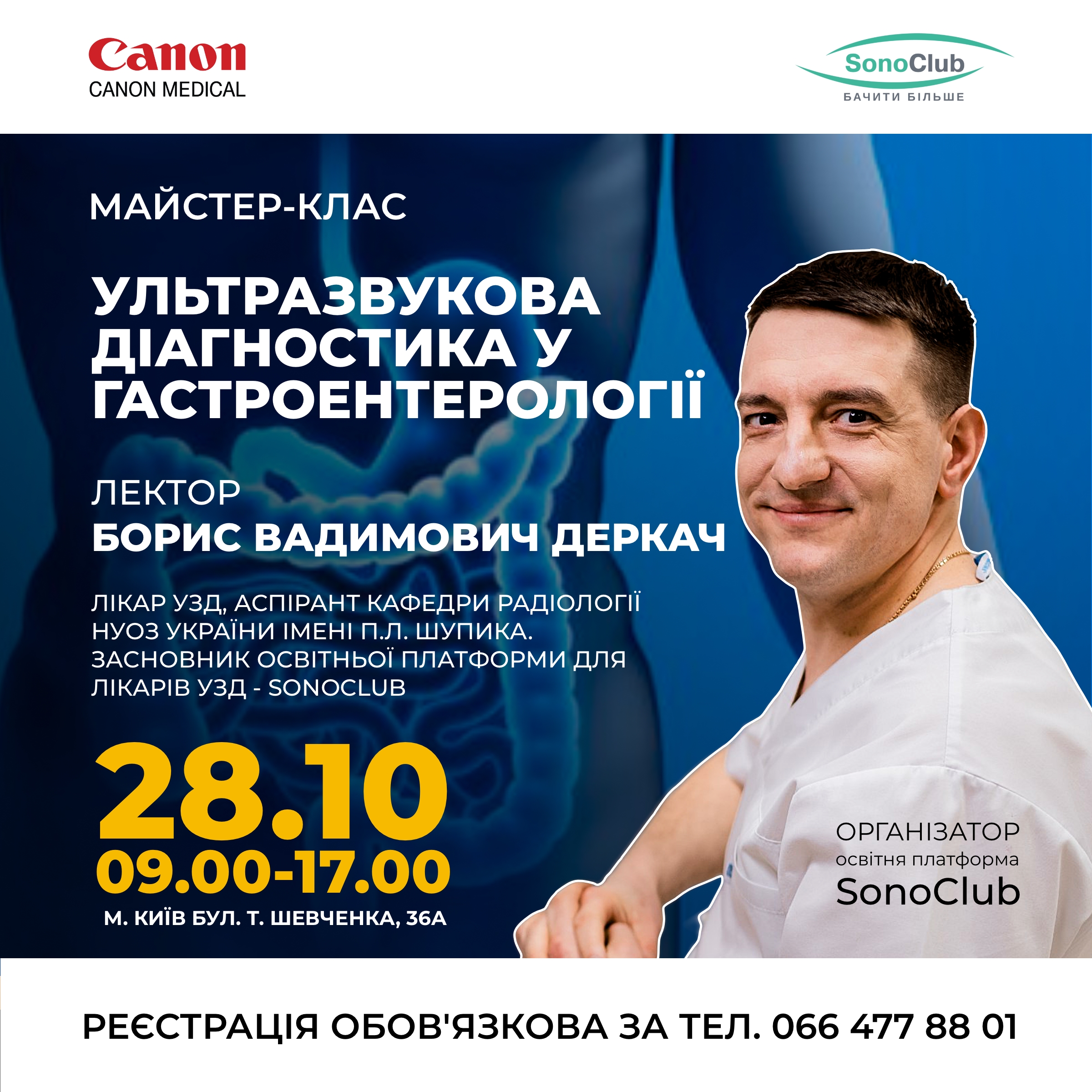 28 жовтня відбудеться очний майстер-клас на тему «Ультразвукова діагностика в гастроентерології». Лекцію та майстер-клас проведе Деркач Борис Вадимович - Лікар УЗД, аспірант кафедри радіології НУОЗ України імені П.Л. Шупика. Засновник освітньої платформи для лікарів УЗД – SonoClub.